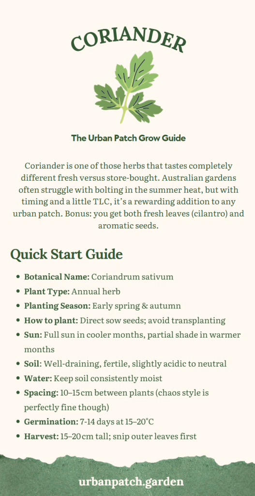 If youâve ever tried to grow coriander in Melbourne and ended up with tall, spindly stems and no leaves, youâre not alone. Coriander has a reputation for being a little bit fussy – the Goldilocks of the herb world. Too hot and it bolts, too shady and it sulks. But with a few tricks, coriander can absolutely earn its place in your urban patch (and in your curries, stir-fries, and zesty salsa nights).