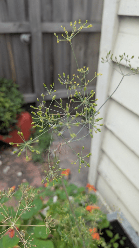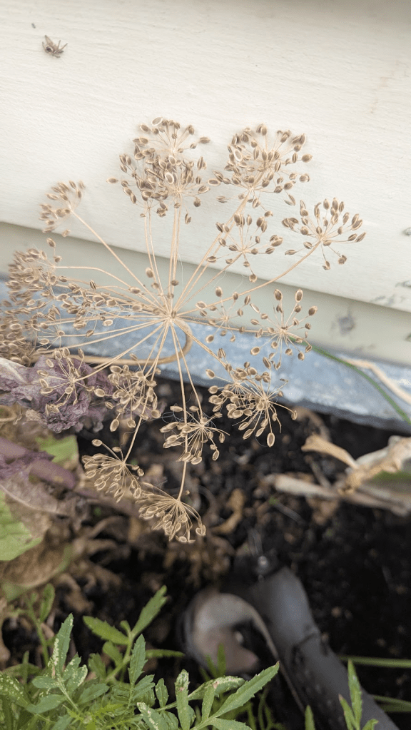 A few days ago I was pottering around the patch and ended up harvesting seeds from a coriander plant and a dill plant that had long since bolted and done their thing. It was the first time I’ve done this – usually I’d have removed these “end of life” plants and planted in something new without a second thought. However, thanks to several weeks of neglect, the coriander and dill had been left to do what nature intended – going to seed to continue their lifecycle.